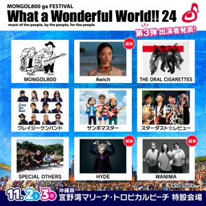 NEWS 2024/07/18 NEWS 【WWW!!24】第3弾出演アーティスト発表!! MONGOL800 ga FESTIVAL “What a Wonderful World!! 24” 第3弾の発表アーティストは、、、 『Awich』 『HYDE』 『WANIMA』 の3組の出演が決定!! 同時にチケットのオフィシャル HP3次先行受付がスタート! 詳細はWWW!!24公式サイトへ▼▼